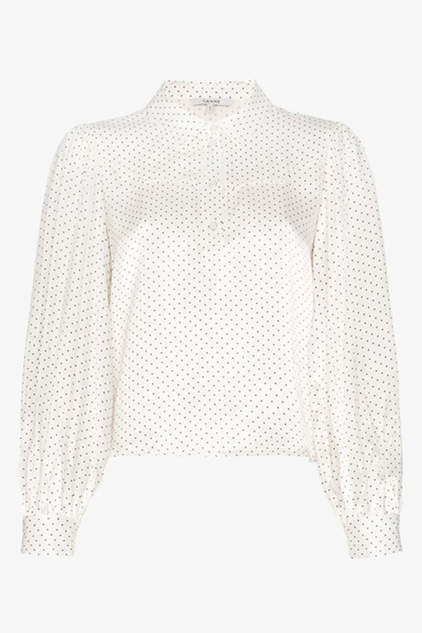 For a more FASHION-FORWARD TAKE ON THE TREND, team a relaxed POLKA-DOT SHIRT with black capri pants. GO FULL 90s with oversized earrings and a baguette bag.