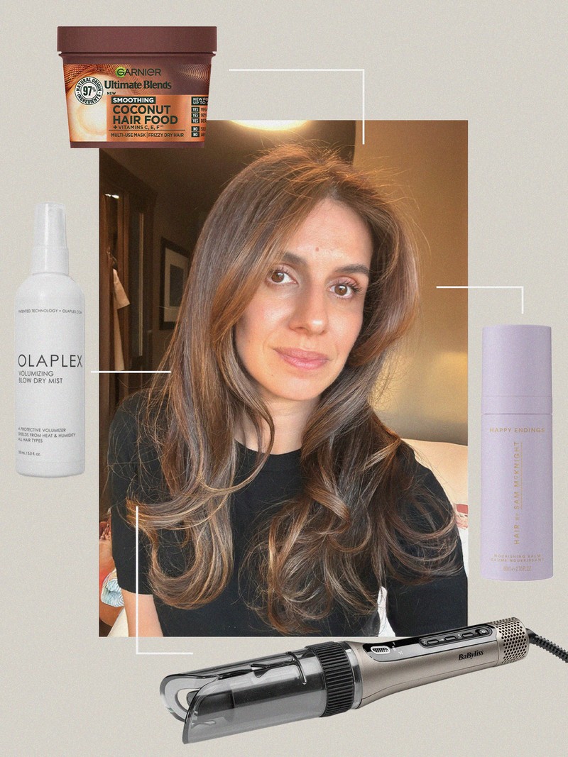“I could honestly do a TED Talk on hair products but since I’m limited to four… a hair tool I’ve become obsessed with is this curler from BaByliss. It’s so easy and quick to use – plus, it smoothes while it styles. You can set the level of drama, whether you want loose waves or tight curls. Before using it, spritzing in this blow dry mist from Olaplex will add more bounce and help your hair hold the style for longer, without any tell-tale residue. I’m not too loyal to shampoos and conditioners, and often just use a hair mask in place of the latter. Garnier’s banana one is a bestseller but I prefer this coconut one, which helps fight the frizz my hair is prone to. If some of that frizz still remains after styling, this deliciously scented balm makes quick work of it, smoothing and defining with none of that tacky, sticky feel.”