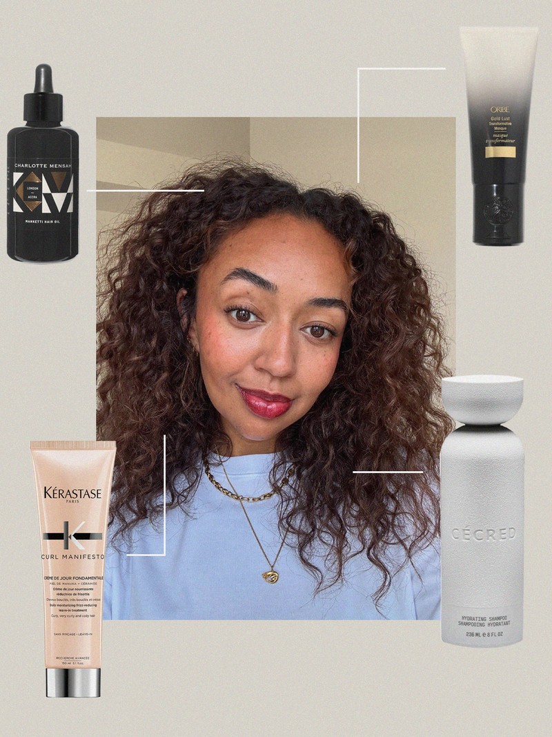 “Having naturally curly hair means I rely on formulas that deeply hydrate without weighing it down, as I have a lot of it but it’s also fine. Kérastase’s Curl Manifesto Leave-In is a non-negotiable. It gives slip, definition and frizz control while still feeling featherlight, plus the scent is beautiful. Oribe has consistently been in my routine for 15 years and the Gold Lust Masque is the nourishing antidote to heat styling and colour. When it comes to shampoo, Cécred’s hydrating option doesn’t get enough love but it’s one of the best I’ve used. It cleanses properly while leaving my hair so soft and hydrated straight from the shower. When my hair is straight, Charlotte Mensah’s Manketti Hair Oil is always the final touch. A tiny (and I mean tiny) amount before or after blow-drying will add shine and keep hair looking smooth. When I was at Liberty, it was consistently in the top ten haircare bestsellers, which tells you everything.”
