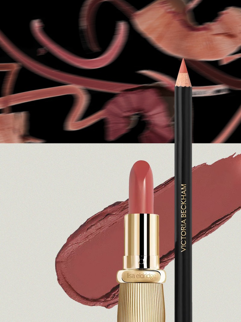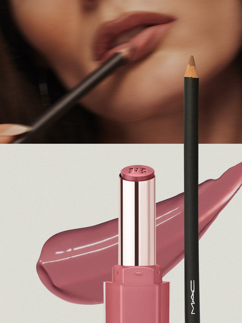 “This pairing embodies understated glamour. The velvety richness of M·A·C’s ‘Cork’ liner offers the perfect contouring base, giving the lips subtle definition and depth, while Fenty’s Gloss Bomb Stix in ‘Is It Fu$$y’ adds a veil of luminous pink with a glass-like finish. Worn together, they create that coveted polished-yet-effortless lip. It’s chic enough for evening, especially when paired with smouldering eyes, yet still modern enough for everyday wear.” – Joy Adenuga, make-up artist