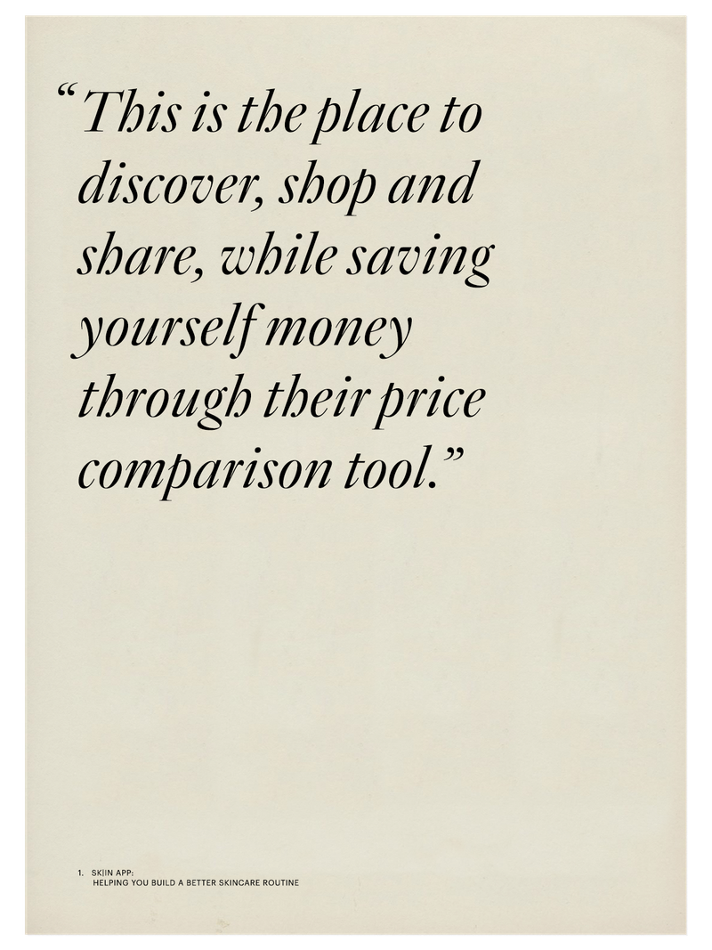 Built on three key pillars; shelf, social & source, SKIN is the new free, price-comparison app seeking to change the way beauty consumers discover, shop and share products. It's set up to work in three simple steps, and it's easy to follow once you sign up: