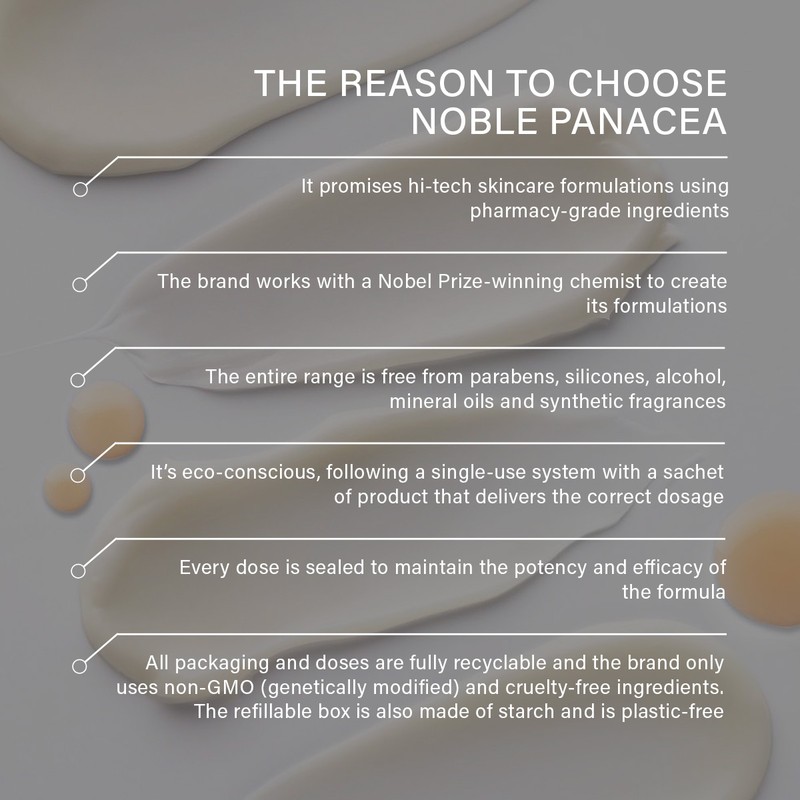 As with all Noble Panacea products, the packaging of The Eye Lift Concentrate is as thoughtful as its formula. Each ‘active dose’ is packaged into individual sachets. Not only does this remove guesswork around the correct amount to apply, but it also preserves the potency of what’s inside, meaning no ingredients are compromised, so the efficacy of the formula remains high. You get 12 doses in total, with each to be used two to three times a week, morning or night – or whenever you feel your eyes need a pick-me-up. As it’s so gentle, you can apply a thin layer on your upper lids and also right underneath the eyes. It’s important to smooth the product as opposed to rub or tap, in order to activate the bio-complex. Don’t forget to run a little between your eyebrows and under the brow bone too, as this is a formula that’s proven to smooth your entire eye contour.