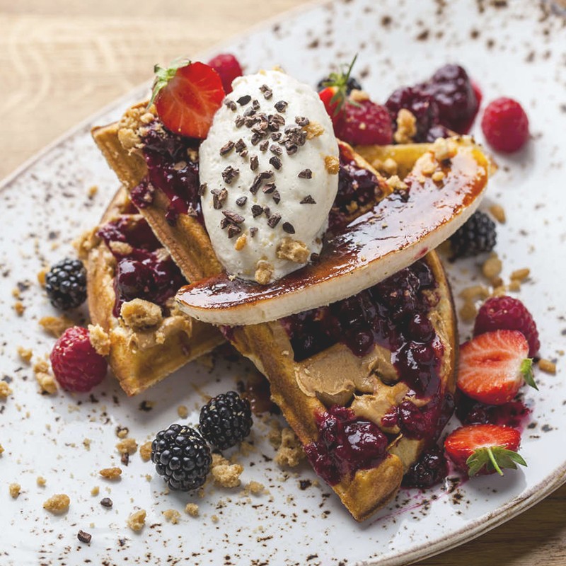 The best bit about this sky-high restaurant isn’t the views – although they’re a massive draw – but the fact it’s open 24 hours (perfect for early starts or late finishes). Served from 6-10:45am, the breakfast menu features the restaurant’s eponymous dish: confit duck leg atop a waffle, served with a fried duck egg and mustard maple syrup. Those with a sweet tooth can substitute the duck for caramelised figs, malted fudge, pistachio butter and plum jam – just ask for the ‘Autumnal Elvis’.