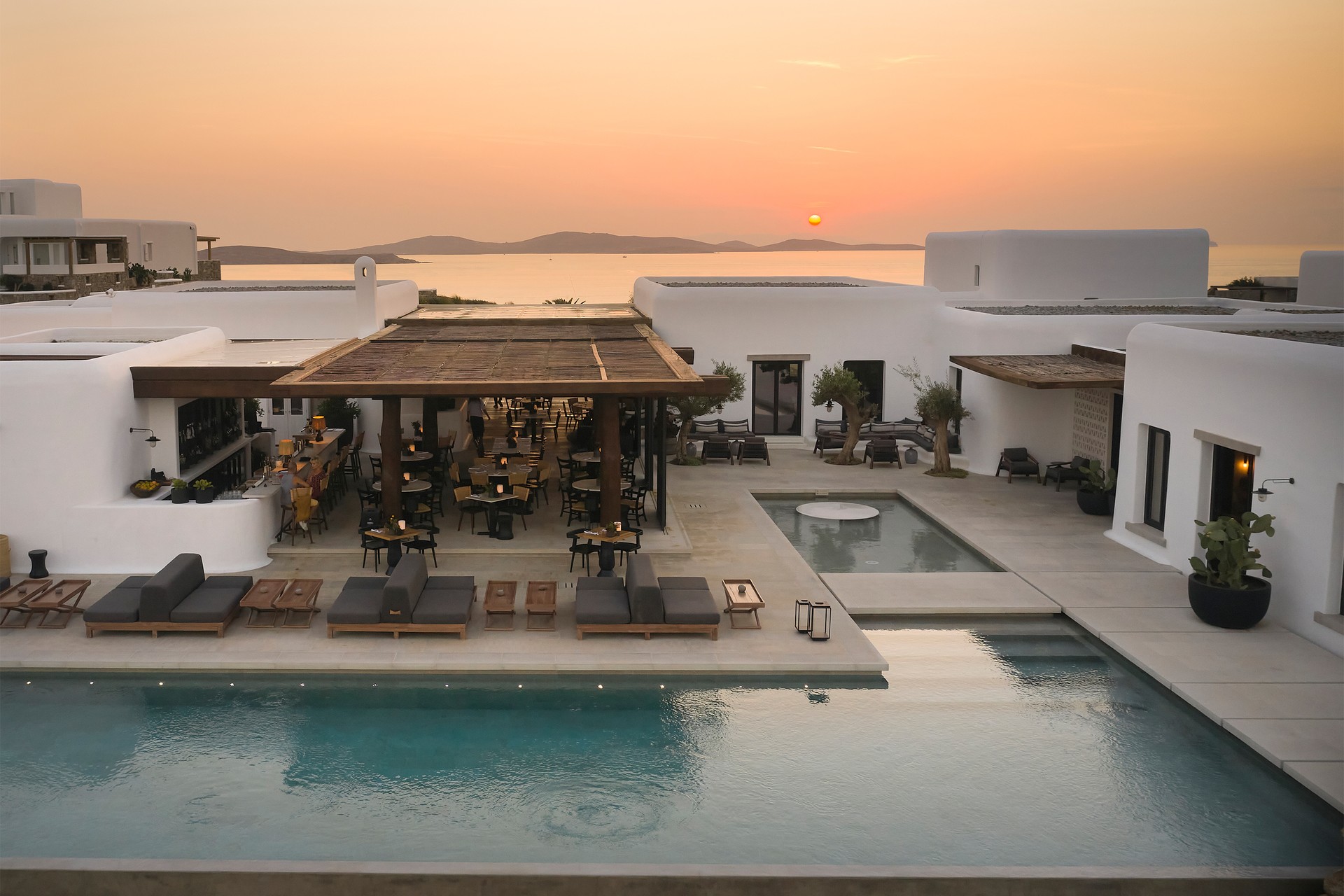 It is, in one word, chic. Yet for all its polish, the vibe is relaxed. Staff greet you by name, music drifts lightly across the terrace, and the whole place feels like a stylish friend’s summer home – if that friend happened to have impeccable taste and a view of the Aegean from every angle. One of Kalesma’s triumphs is its orientation. It’s one of the few spots on the island where you can watch both sunrise and sunset from the same place – a detail that becomes a daily ritual, whether you’re an early riser or simply lingering over a late dinner.