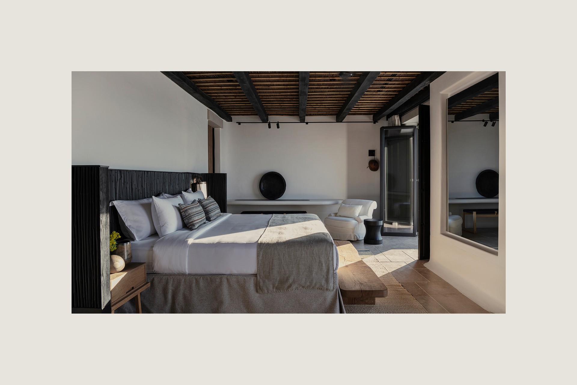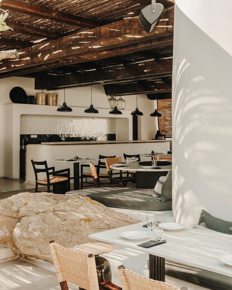 Kalesma’s 25 suites and two villas are designed for indoor–outdoor living. The aesthetic is contemporary and pared back: whitewashed walls, smooth stone, timber accents and soft, earthy textiles. It’s minimalist without feeling cold. Bathrooms are generous, with stone tubs and saltwater showers, some tucked outdoors on private patios. All rooms have sea views, and the terraces are large enough for sunbathing, dining or simply watching the light shift across the bay.