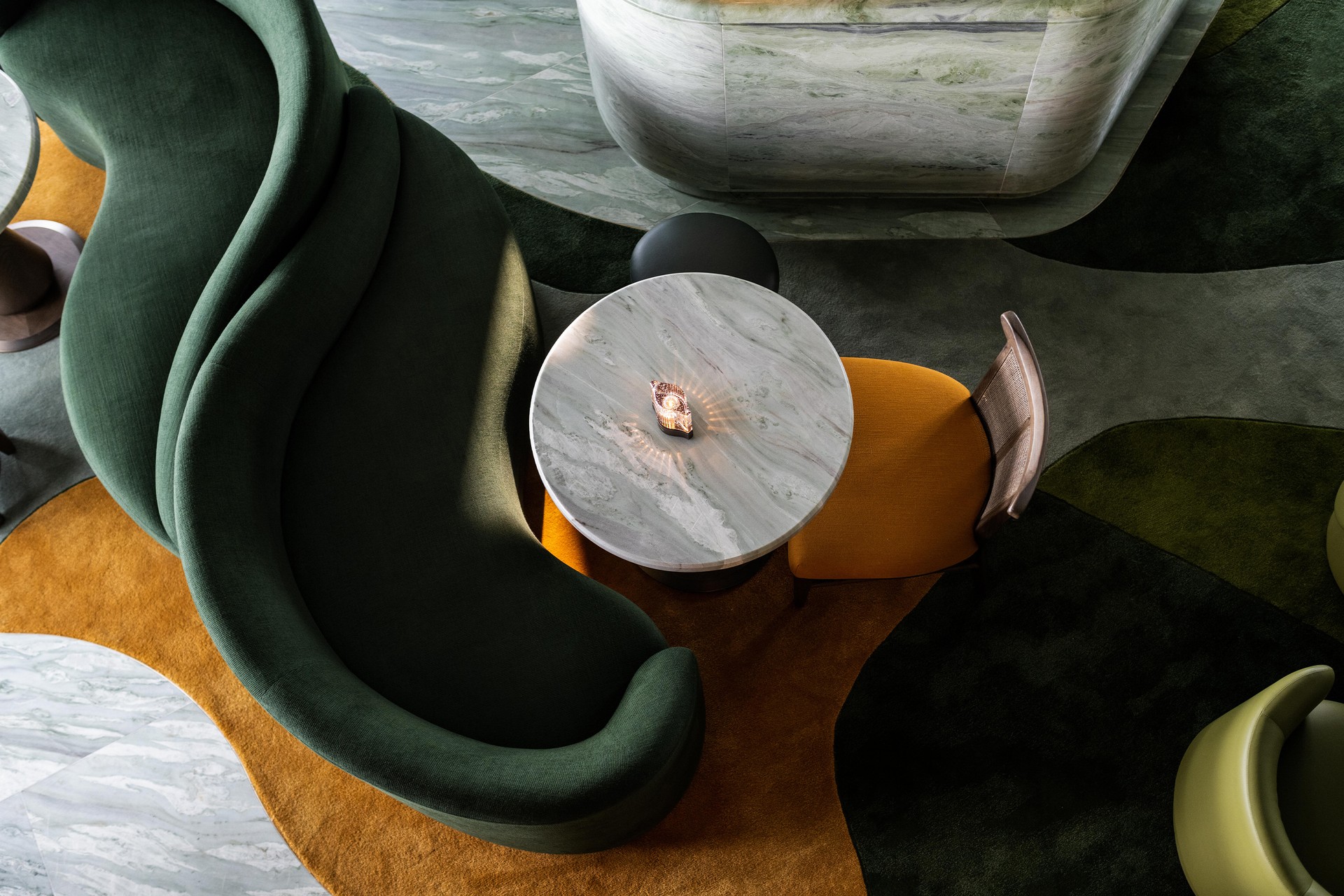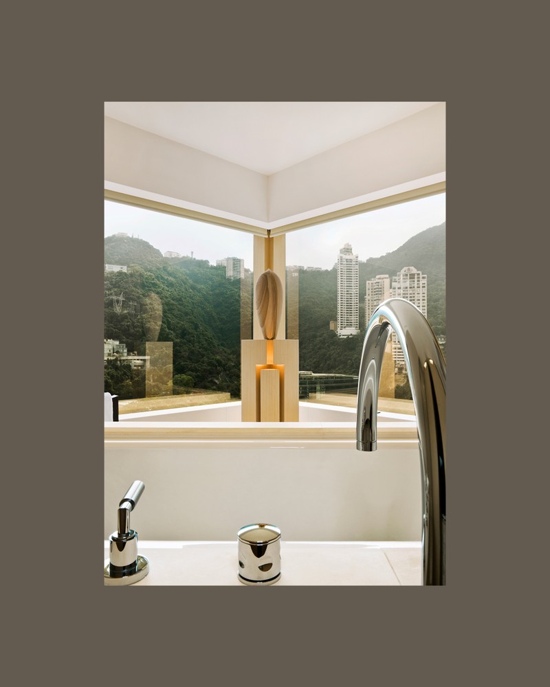 While the three share DNA – a strong sense of place, beautiful design, hyper-personalised service – each is distinctive. The Upper House centres around Fu’s concept of the ‘upward journey’. Perched on the top 11 floors of the JW Marriott skyscraper, his vision becomes clear the moment you arrive. Pulling up to the sculptural Thomas Heatherwick-designed concrete entrance, which envelopes the base of the building like curtains, even the ground floor appears to be floating, thanks to a glass box lobby and the water features surrounding it. Statement escalators deliver guests to the lifts, which take seconds to shoot 39 floors up into the cocoon of the hotel. It’s a singular experience with the effect of whisking you a world away from the high-energy city outside. That sense of escape is only enhanced by the calming ginger and verbena Andre Fu scent deployed throughout the hotel.