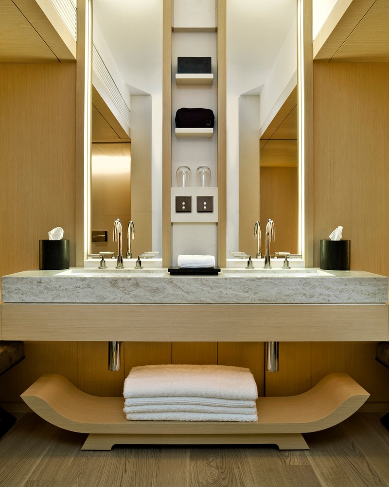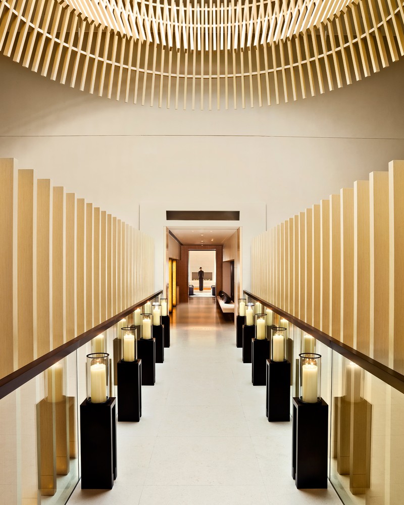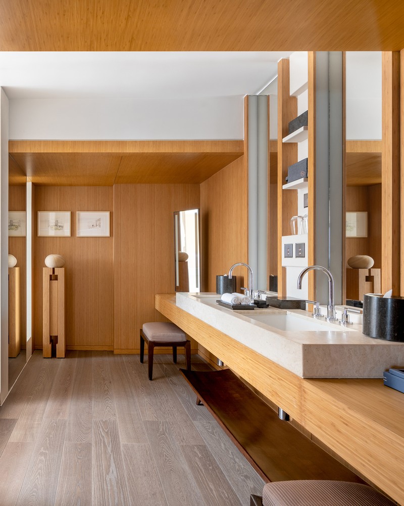 In London, Andre Fu’s design is best showcased via his stunning suites at the Berkeley and the top two floors at the Emory just next door in Knightsbridge. His signature materials of natural bamboo, timber, shoji glass, limestone and lacquered paper are shown off to great effect in the Upper House too. The palette is neutral, the beds enormous and the lighting intuitive. Those huge panes are hugged by window seats, and coffee-table books are artfully stacked for the ultimate reading nook. Then there’s the Bamford-stocked bathrooms – visions of wood and limestone, with twin vanities, walk-in rain showers and enormous baths to soak away any residual jet lag. There are striking floor-to-ceiling windows here too, but as you’re given the tour, the team will suggest the blinds come down for modesty – unless you fancy being spied showering by office workers in the high-rises opposite. For all this on a supercharged scale, look to book the Andre Fu Suite or Penthouse.