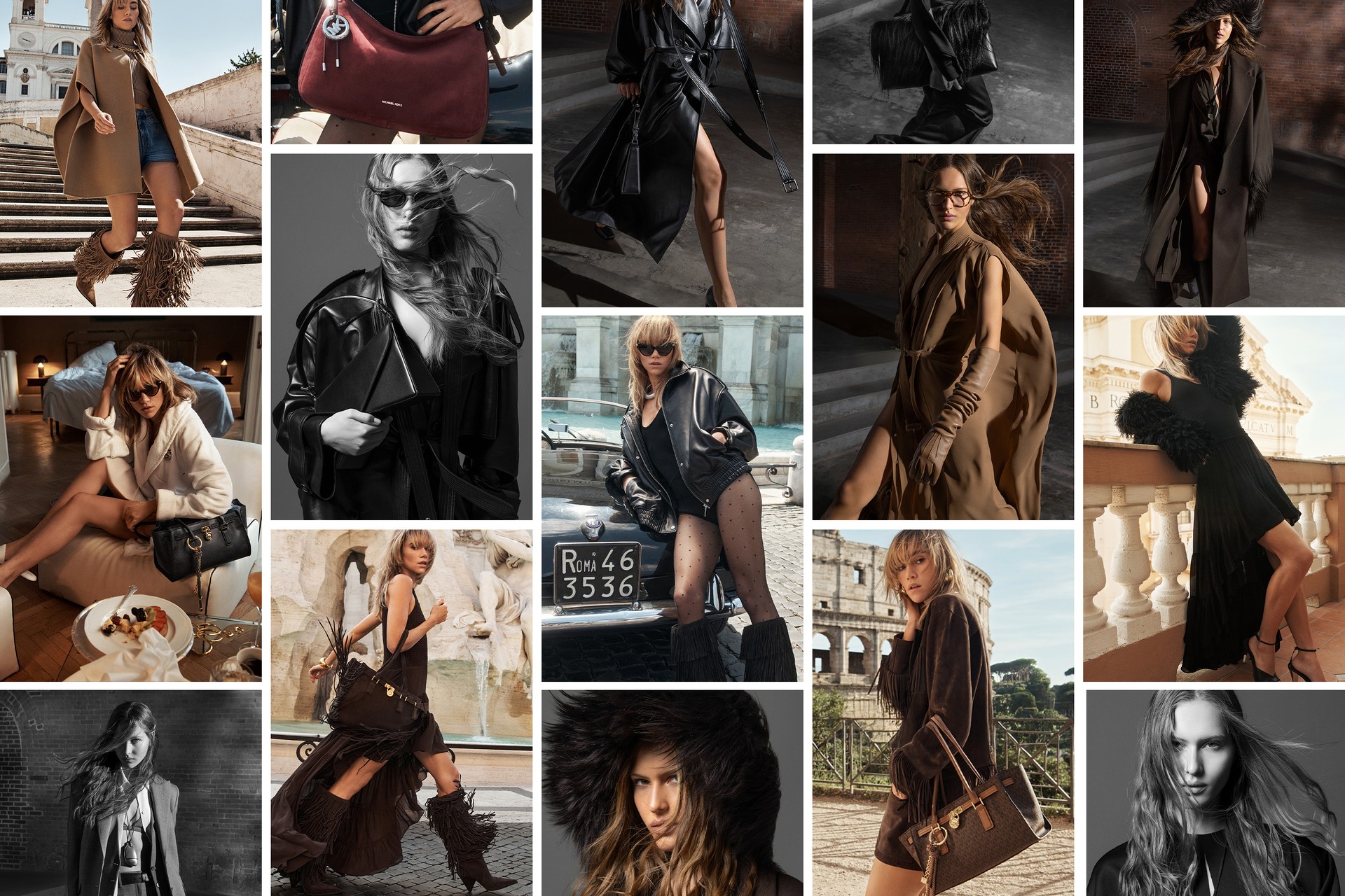 The Michael Kors Fall 2025 campaign brings Rome to life through the lens of Lachlan Bailey, and stars Suki Waterhouse and Logan Lerman. The collection is a masterclass in statement dressing: think tailored outerwear in rich autumnal tones, fringed jackets that catch the light with every movemen, and reimagined silhouettes of the brand’s iconic Nolita and Hamilton bags. Luxe knits, structured blazers and versatile layering pieces are styled with an ease that feels entirely modern, with each outfit making a subtle nod to Roman elegance.