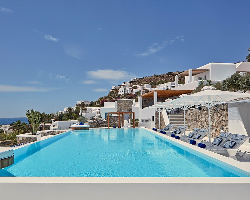 This family run hotel is proof that small can be beautiful, not to mention super exclusive; think private beaches, private yachts and private dining. Combining modern luxury with traditional architecture, the interior of the hotel features the owner’s private collection of over 2,000 antiques, while marble and mosaic paths weave around the exterior of the property. With three restaurants to choose from, guests are spoilt for choice when it comes to eating out, including a private dining option if dinner on a boat, dock or the beach sounds better. Located on Ornos Bay, a ten-minute walk away from Mykonos Town, guests have the option to visit the town’s impressive collection of bars and restaurants, too.