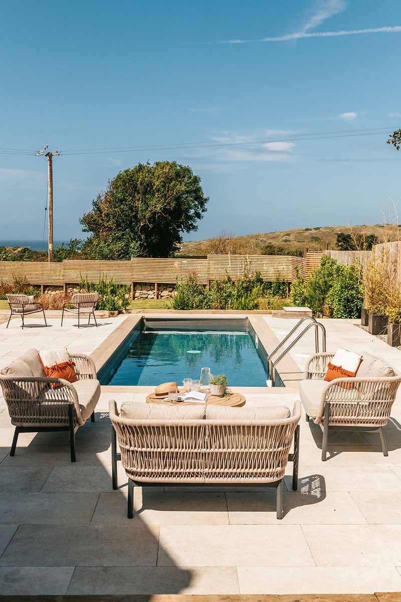 This coastal retreat near Gwithian has a serious wow factor. The former farmhouse has been transformed into a contemporary holiday home with stone floors, slaked lime walls and boutique interiors that complement the light, bright rooms. The house has five bedrooms – three of which are en-suite – including a dramatic primary suite with a balcony and dressing room. Guests can enjoy a heated plunge pool, hot tub and games room, or relax in the vaulted lounge with views across the seaward garden. Guests will find thoughtful details throughout, from a bean-to-cup coffee machine to Sonos speakers, as well a cool ‘cube’ freestanding wood burner in the living room.