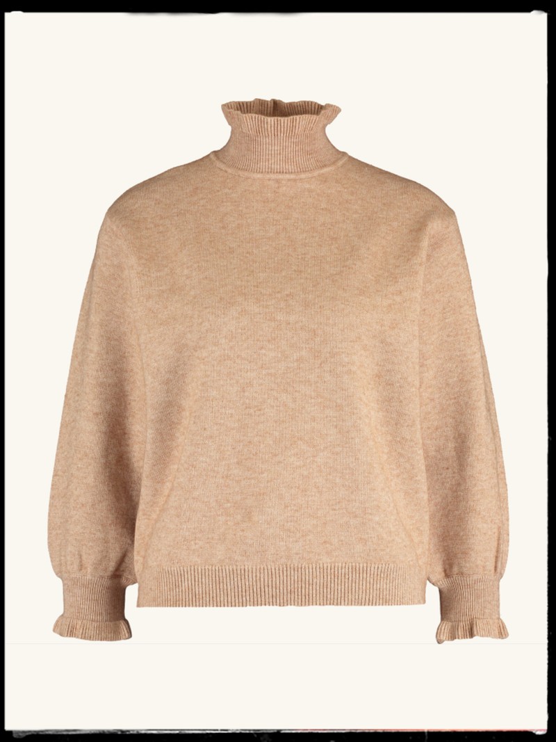 We love the pretty frill edging on the collar and cuffs of this light knit. Wear it with anything from jeans to leather trousers.