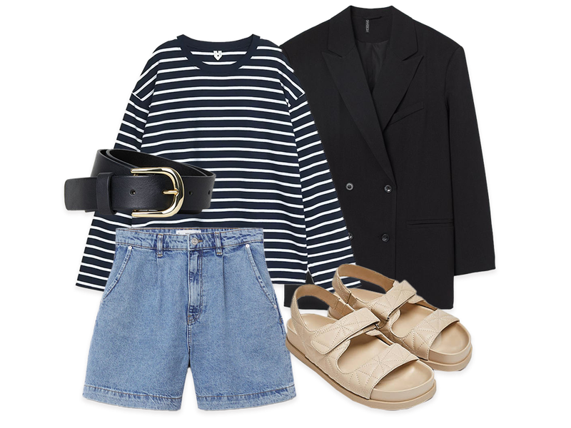 Channel Parisian vibes with a breton top and blazer, keeping things casual with denim shorts and chunky sandals.