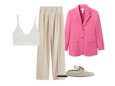 Add a pop of colour with this slightly oversized pink blazer. Neutral tailored trousers simplify the look, in turn creating the perfect spring day to-night outfit.