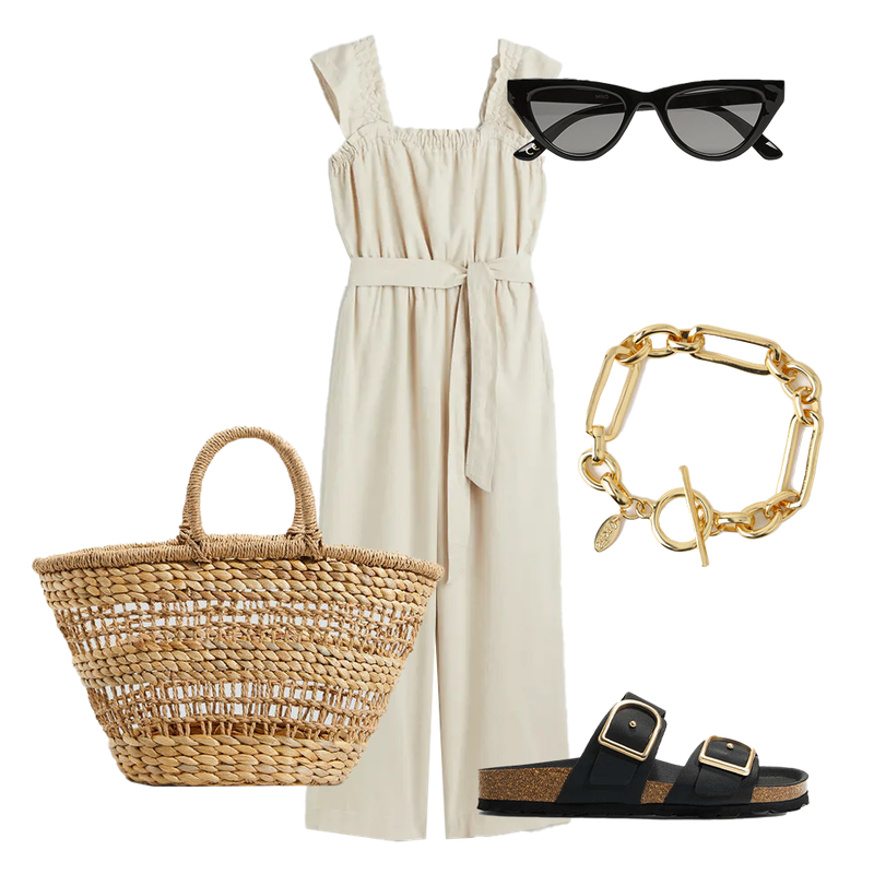 Go monochrome by styling this playsuit with black sunglasses and slides. Accessorise with a chunky gold chain and a raffia basket bag.