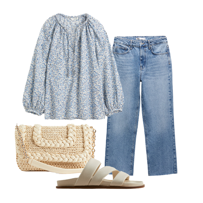 For everyday, you can’t go wrong with jeans and a floral blouse. These leather sandals and straw shoulder bag are all you need to complete the look.
