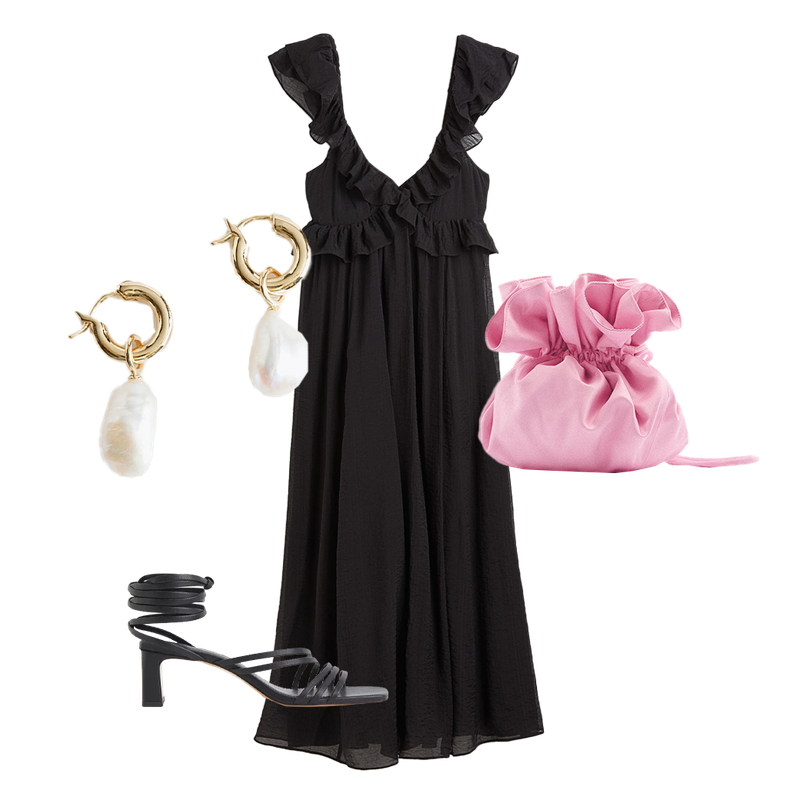 An event outfit doesn’t have to be expensive. Style this ruffled H&M dress with this sweet pink pouch, pearl earrings and strappy black sandals.