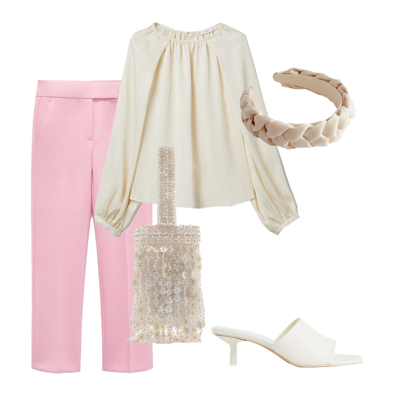 Tailoring can also be affordable – simply dress up these pink trousers with a smart satin blouse. Tonal accessories, like this braided headband, will create a smart evening look.