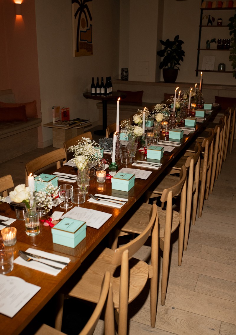 The team and friends were treated to dinner at the stylish Honey & Co on Store Street in London's Bloomsbury. After some spiced rum cocktails and a fresh spin on G&Ts, everyone feasted on creamy hummus with marinated chickpeas and tahini, labaneh topped with pumpkin and apple and stuffed aubergine rolls. This was followed by spiced butternut squash and chickpea koftas and sea bream fillets braised in rich tomato stew with fennel salad and zehug. After a spectacular cold honey and feta cheesecake, guests took home traditional jam doughnuts from Borough 22, along with Judaica tree ornaments from Jonathan Adler.