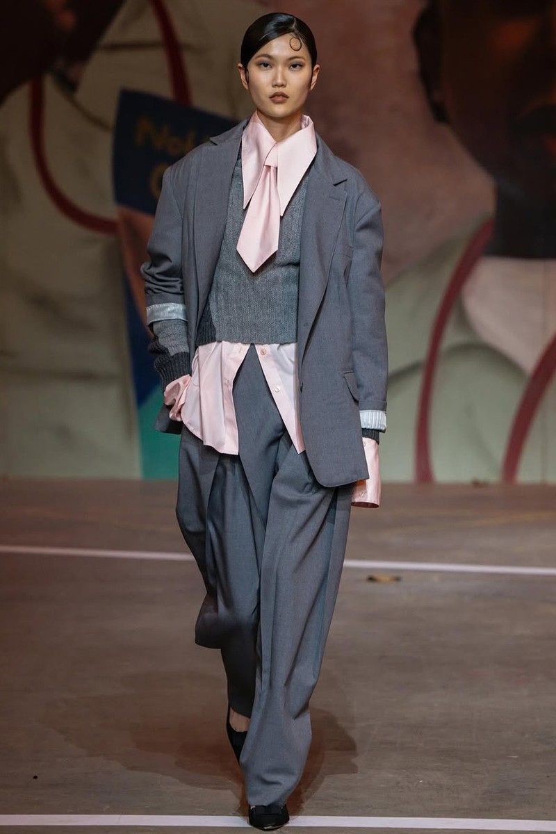 Unsurprisingly, drama took centre stage at Harris Reed, where high-impact silhouettes and high-shine finishes delivered a sense of theatrical glamour. The tailoring was softened with more fluid draping, while metallic accents and sweeping proportions added impact. Bold yet elegant, the overall mood felt cool and expressive.