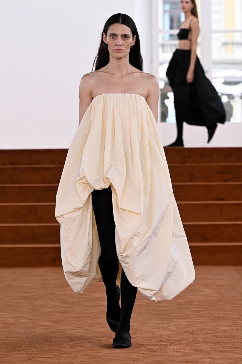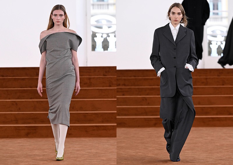At Giorgio Armani, a palette of grey, sage and soft blue unfolded with brighter touches of white, while hints of burgundy carried the collection through into evening. There, silhouettes dissolved into weightless layers – tunics floating over trousers, crinkled textures and intricate embroidery inspired by mountain landscapes and realised through exceptional craftsmanship.