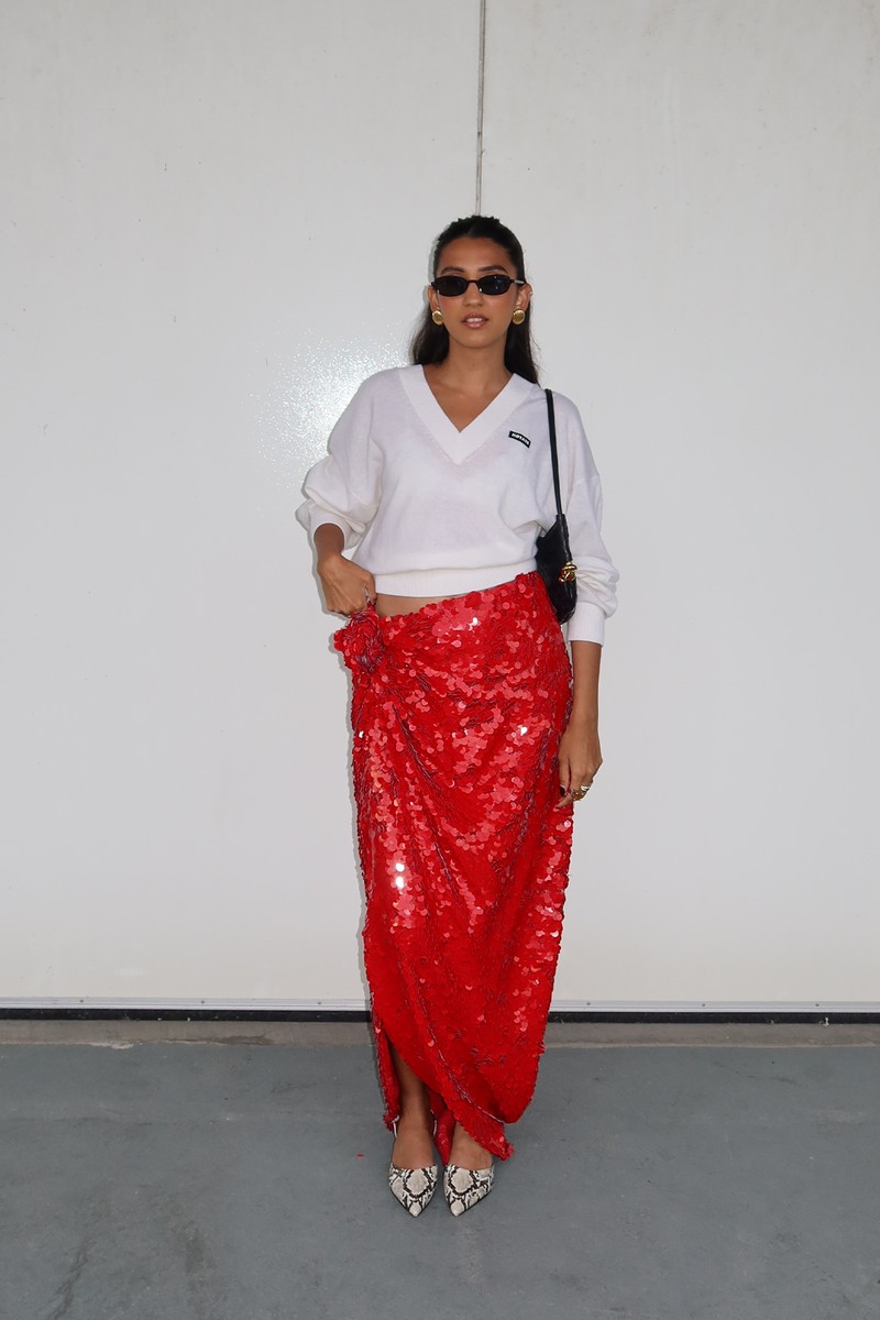 For ROTATE, I teamed the red sequinned skirt with a cream knit and simple heels. Polly and I went backstage to get a sneak peek at the Caia Cosmetics collab in action – fresh, glowy skin with just a touch of colour on the lips – before heading out front for what turned out to be one of the most feminine collections I’ve seen the brand do. There was a boho lightness to it – chiffons, sheer floor-length gowns and scarf-tied dresses that moved beautifully – but plenty of looks that felt grounded too. I loved a sharp trench worn with red heels and shorts, plus a silky mini playsuit felt like the ultimate holiday piece. This was also ROTATE’s first foray into shoes – a seriously strong debut with punchy colours, sculptural heels and a standout dalmatian-print style I can already see selling out. When catching up with the founders Jeanette and Thora post-show, as well as Caia brand founder Bianca Ingrosso, the trio raved about the response to the collection and how incredible it was to work on. Pushing the boundaries of what the brand usually does was a risk they were scared to take – but one that paid off.