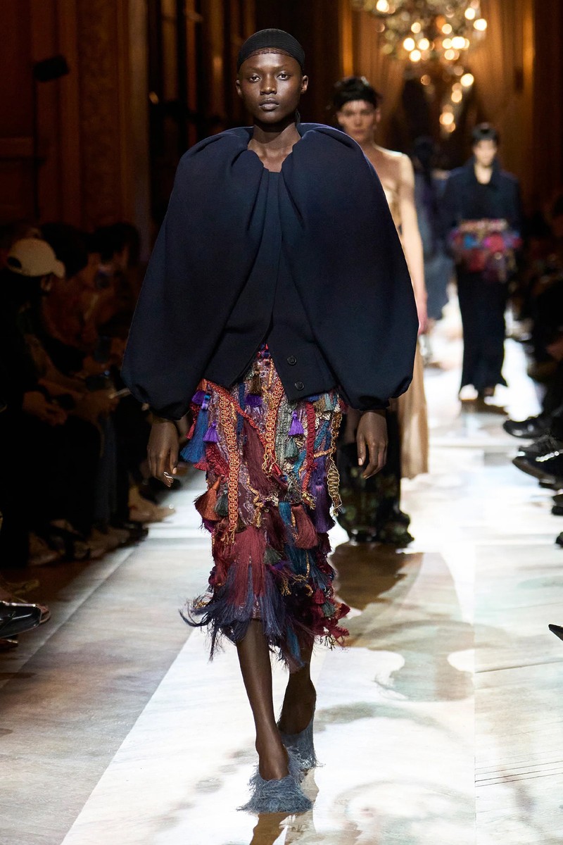 Dries Van Noten’s runway show was the perfect mix of undone elegance and quiet luxury. Slouchy tailoring reigned supreme, with oversized blazers, wide-leg trousers and sharp-shouldered coats exuding a relaxed yet refined attitude. Luxe textures – think plush velvet and metallic jacquards –added depth, while embellishment and embroidery gave the pieces that signature Dries edge. The overall vibe was effortlessly cool, slightly offbeat, and undeniably chic – exactly what you’d expect from a brand that epitomises modern sophistication.