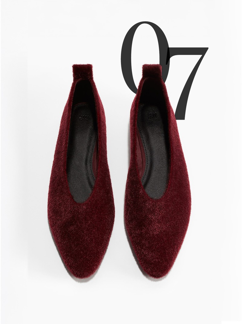 Unusual textures are a clever way to elevate high-street finds. The rich burgundy and high vamp on these flats add extra punch.