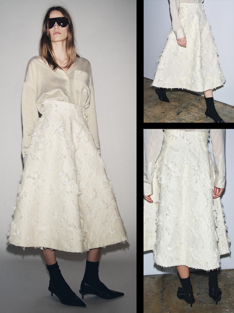 This voluminous textured skirt has a couture-inspired look. The midi silhouette and subtle floral detailing give it an elegant, fashion-forward finish.