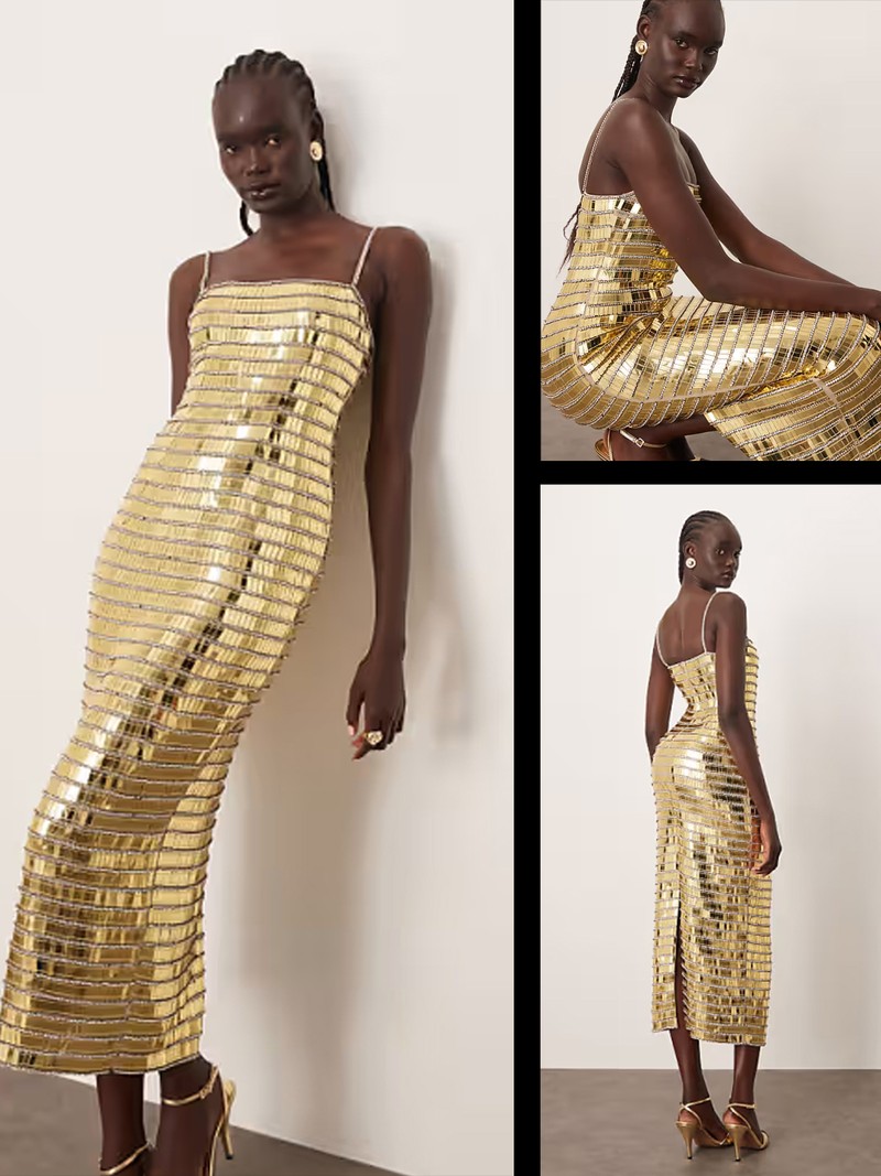 With its intricate gold embellishment and sharp silhouette, this ASOS dress channels designer glamour without the high-end price tag – a standout choice for the festive season.