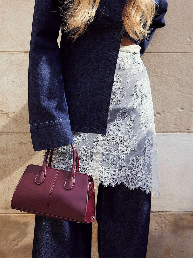 Take cues from The Row and layer a lace dress over dark denim before finishing with a burgundy bag for a look that’s both showstopping and wearable.