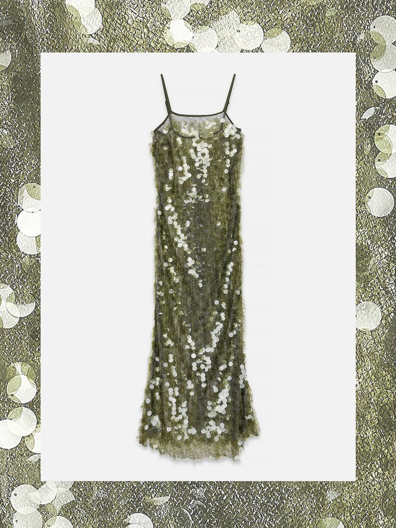Sequin slips are set to dominate party season and this khaki style feels like a fresh take on the trend. Make it work for the colder weather by layering it under an oversized blazer or a chunky knit and finishing with knee-high boots.