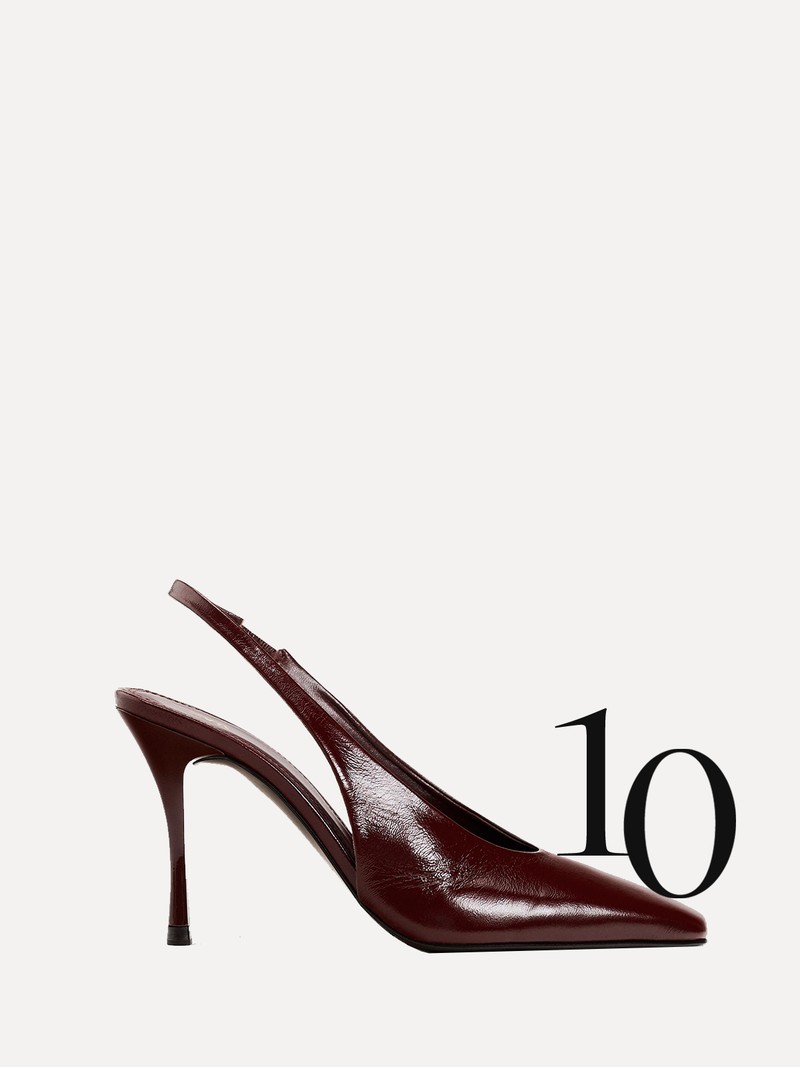 If you love Saint Laurent’s power heels, you’ll love Zara’s patent burgundy version. Bold and sculptural, they’ll elevate everything denim to stirrup leggings.