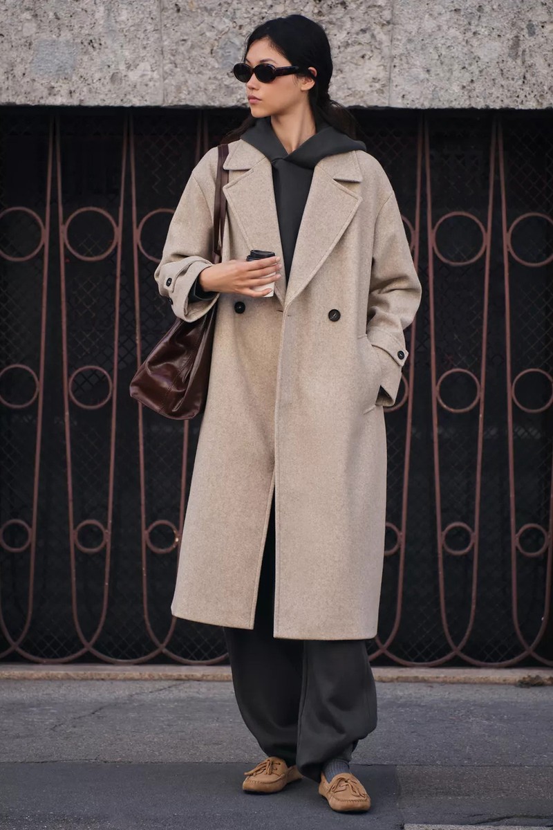 A SLEEK WARDROBE ESSENTIAL, style this wool-blend coat with a burgundy shoulder bag and some studded flats for an INTERESTING ALL-DAY LOOK.