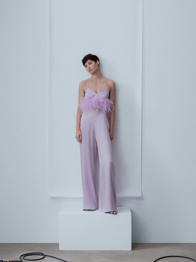 Satin Top With Feather Detail, £170 | Satin Palazzo Trousers, £120