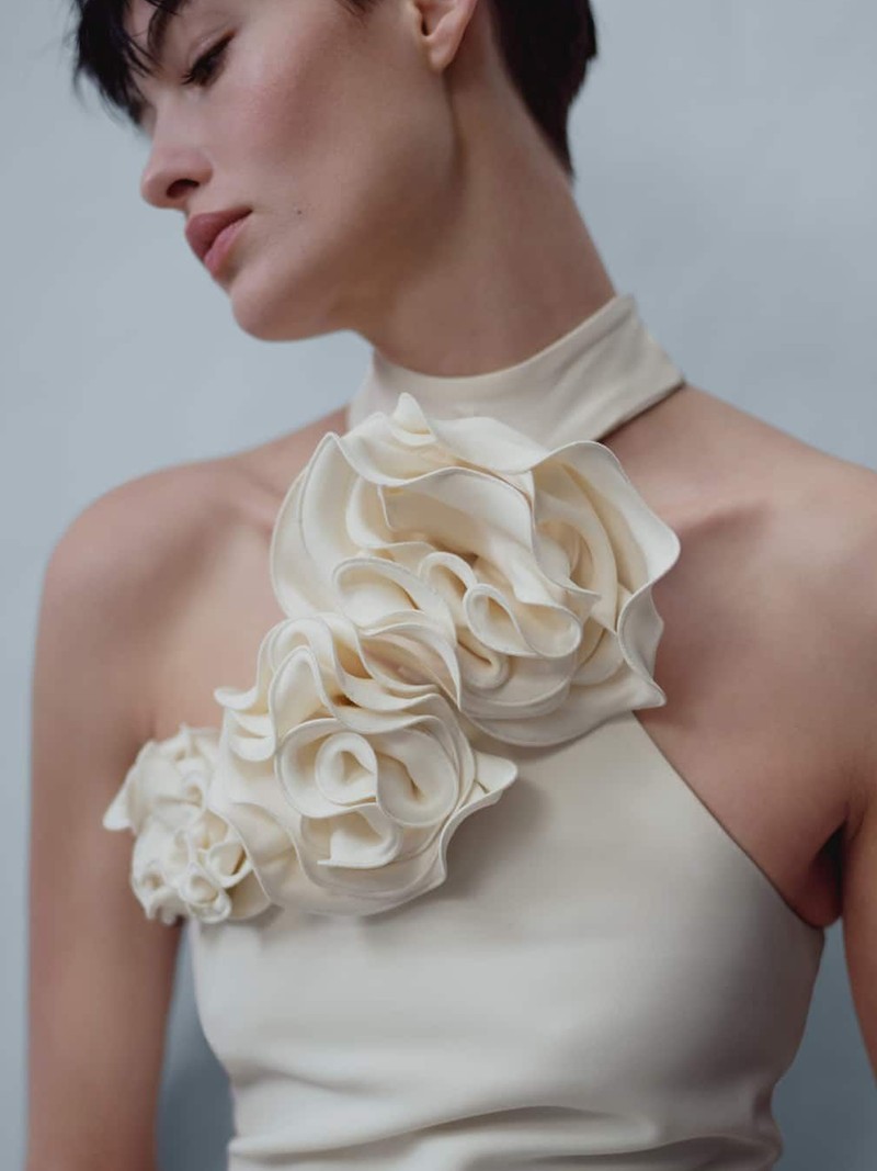Corsage details are the breakout trend of the season. This white dress has serious designer vibes – the romantic 3D flowers are complemented by the flowy fabric and daring open back.