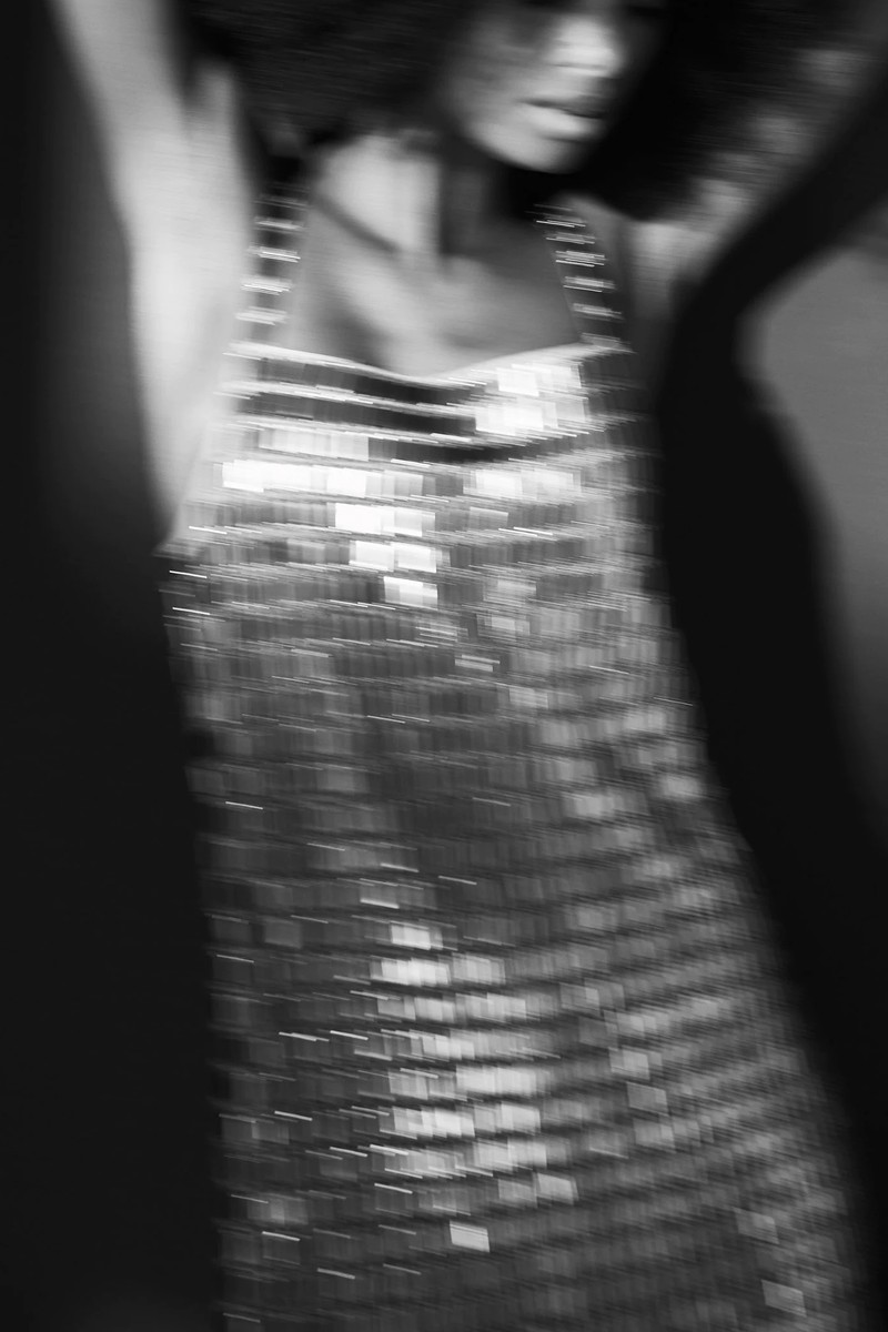 This rhinestone miniskirt is a HERO party piece. Add a plain WHITE TEE and black boots for an EFFORTLESS night-out look.