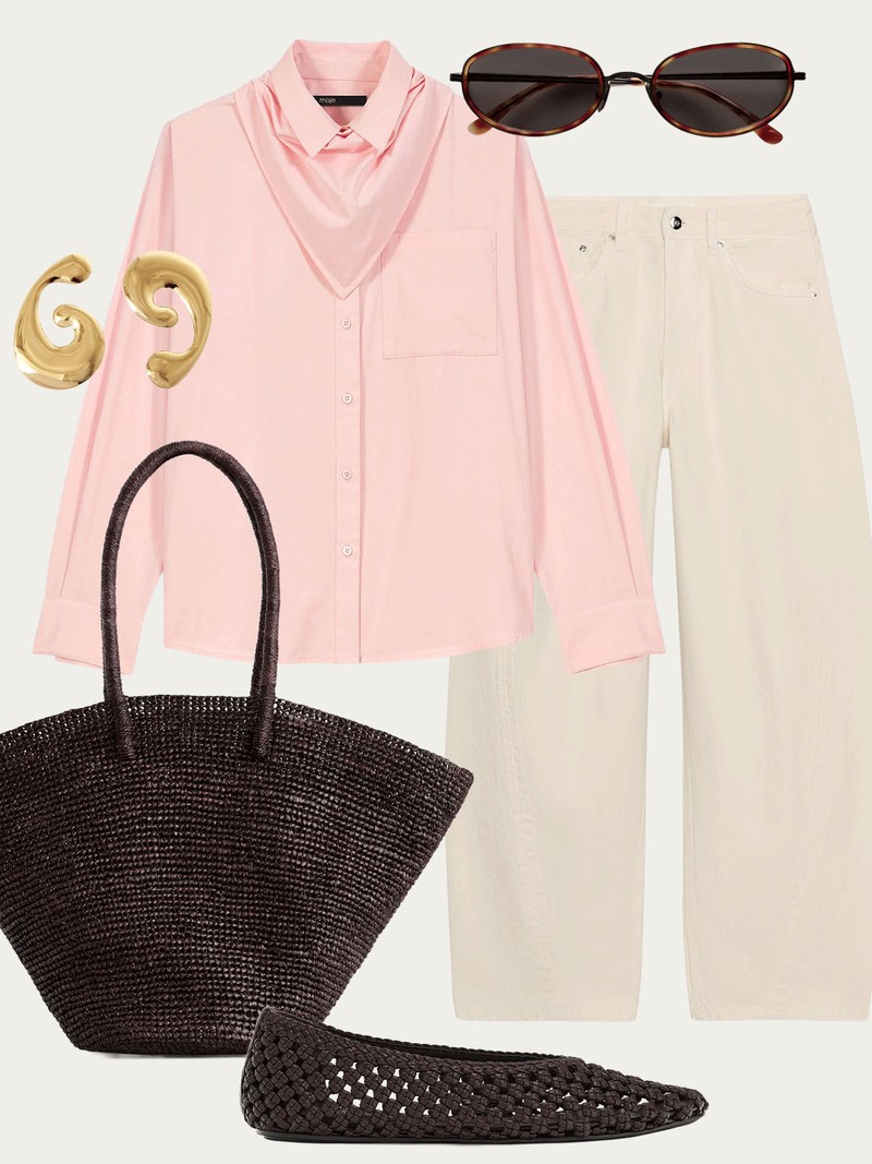 Pair the pink blouse with relaxed barrel-leg jeans for an easy, off-duty look. Add braided ballet flats and a basket bag to strike that perfect balance between laidback and polished.