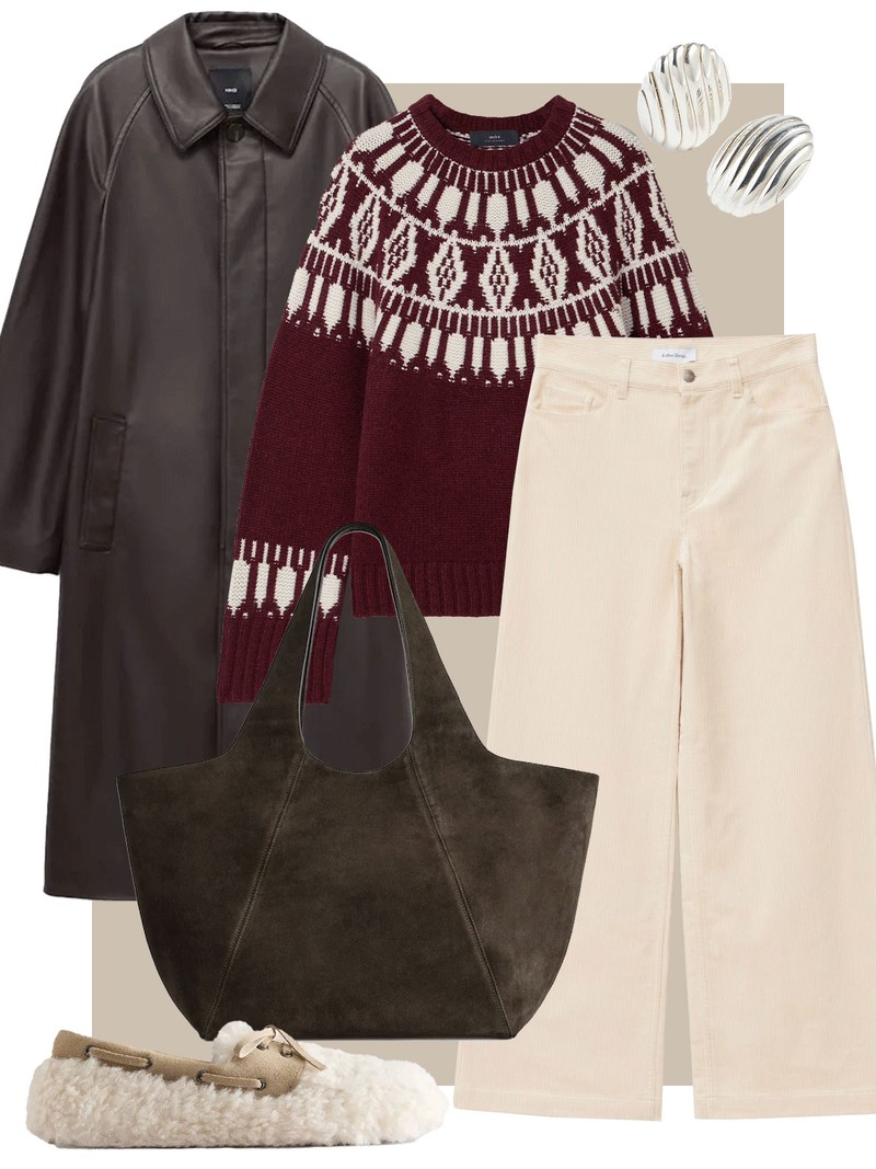 For a laidback festive look, team these cord trousers with a burgundy Fair Isle knit. Finish things off with a relaxed suede tote and cosy shearling moccasins.