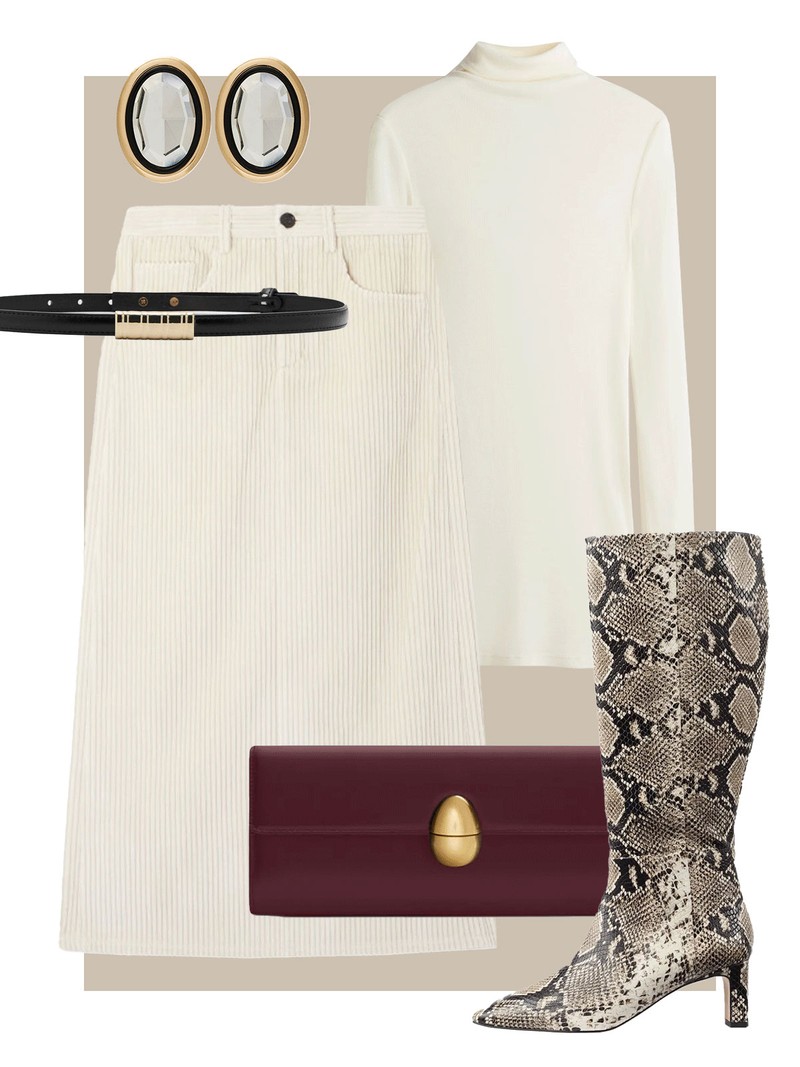 This cream corduroy skirt will work hard in your wardrobe. Dress it up for evening with a fitted body, a statement belt, snakeskin boots and big earrings. The red bag adds a fashion-forward touch of colour.
