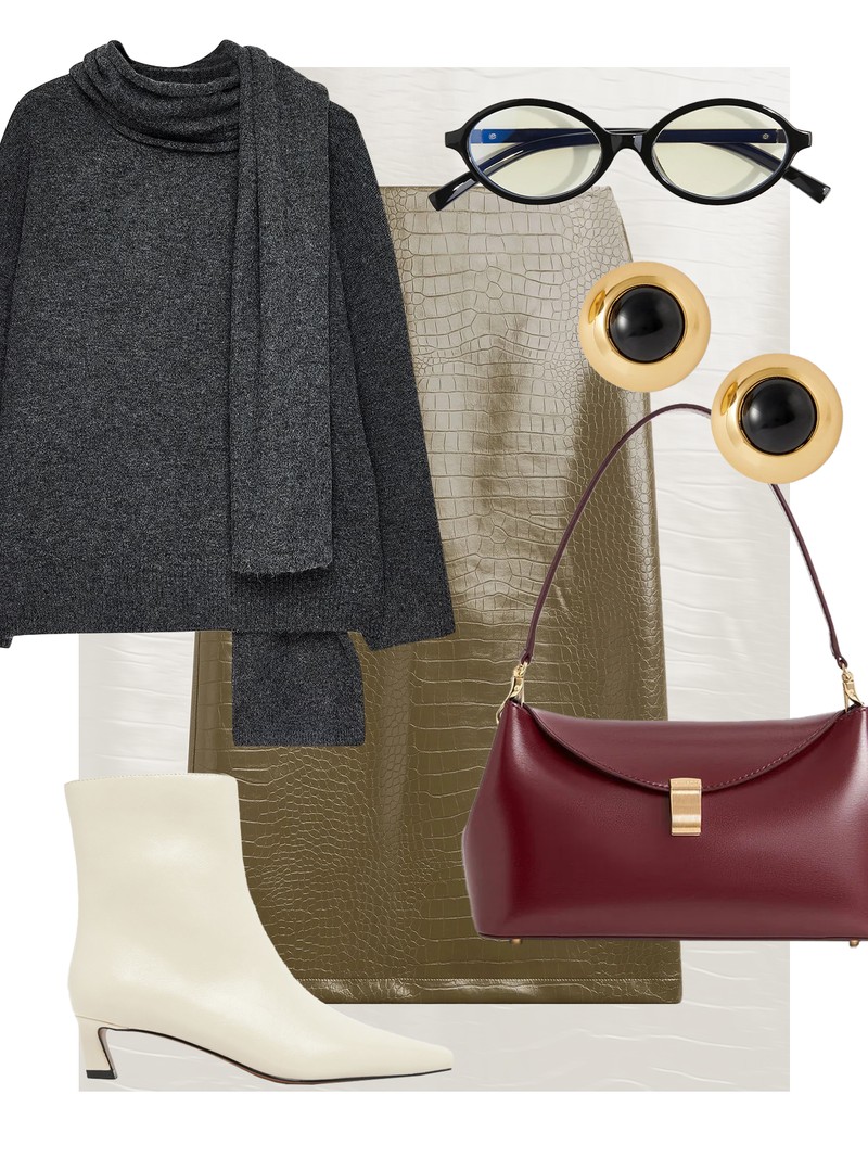 A scarf-detail knit is another must-have this season. Add white boots for a fashion-forward touch and finish with a colour-pop bag.