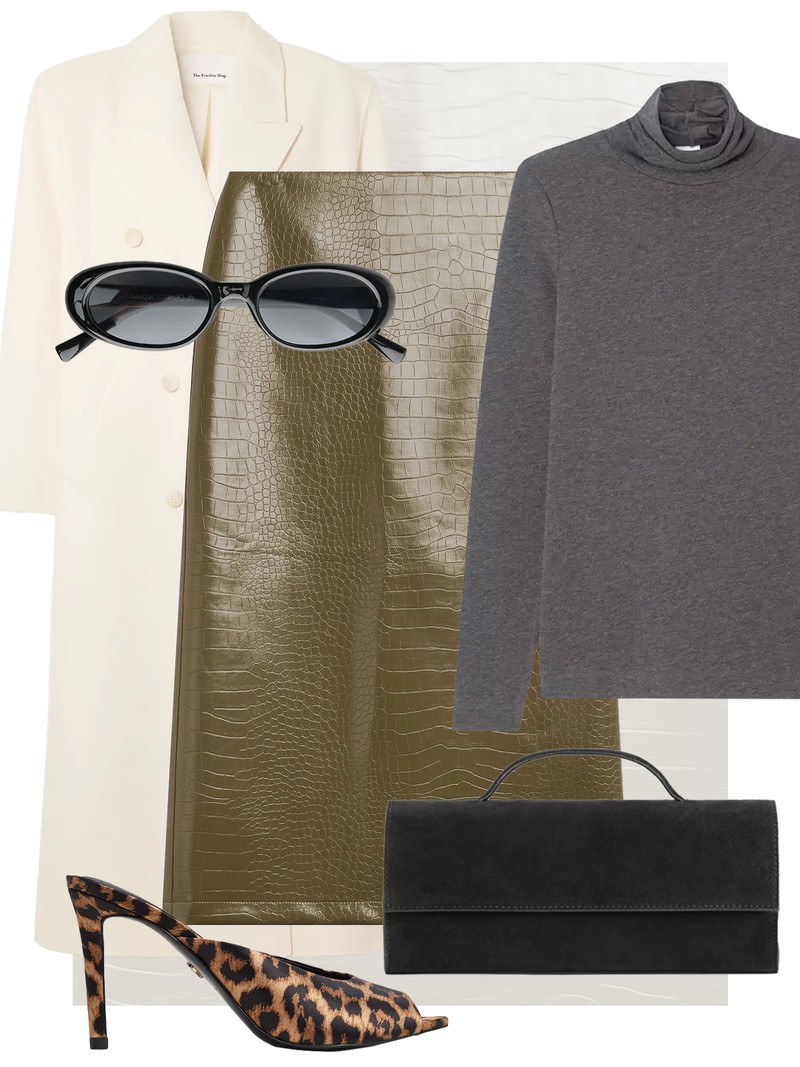 A polo-neck and pencil skirt make for a sharp, feminine silhouette. Layer over a long duster coat, while animal-print heels add a cool, unexpected twist.