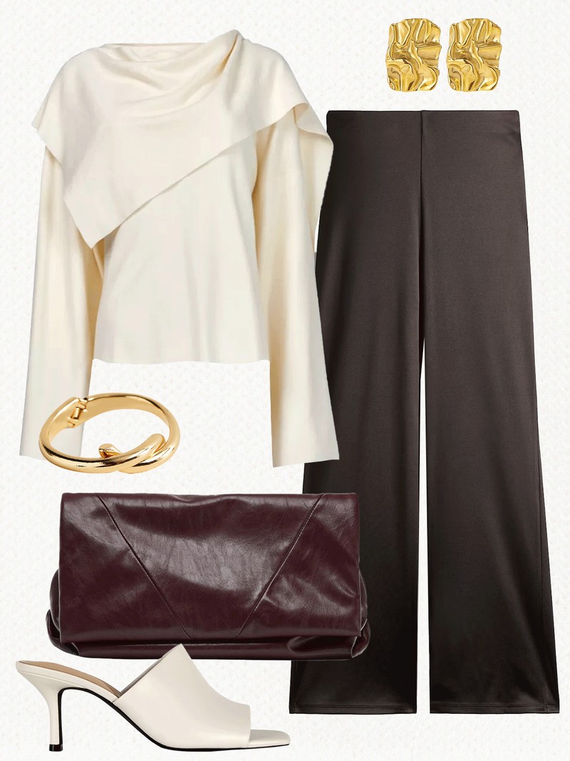 This satin top from Leem is the kind of versatile piece every evening wardrobe needs. Black satin trousers and heeled mules will elevate the look, while a burgundy clutch adds further polish.