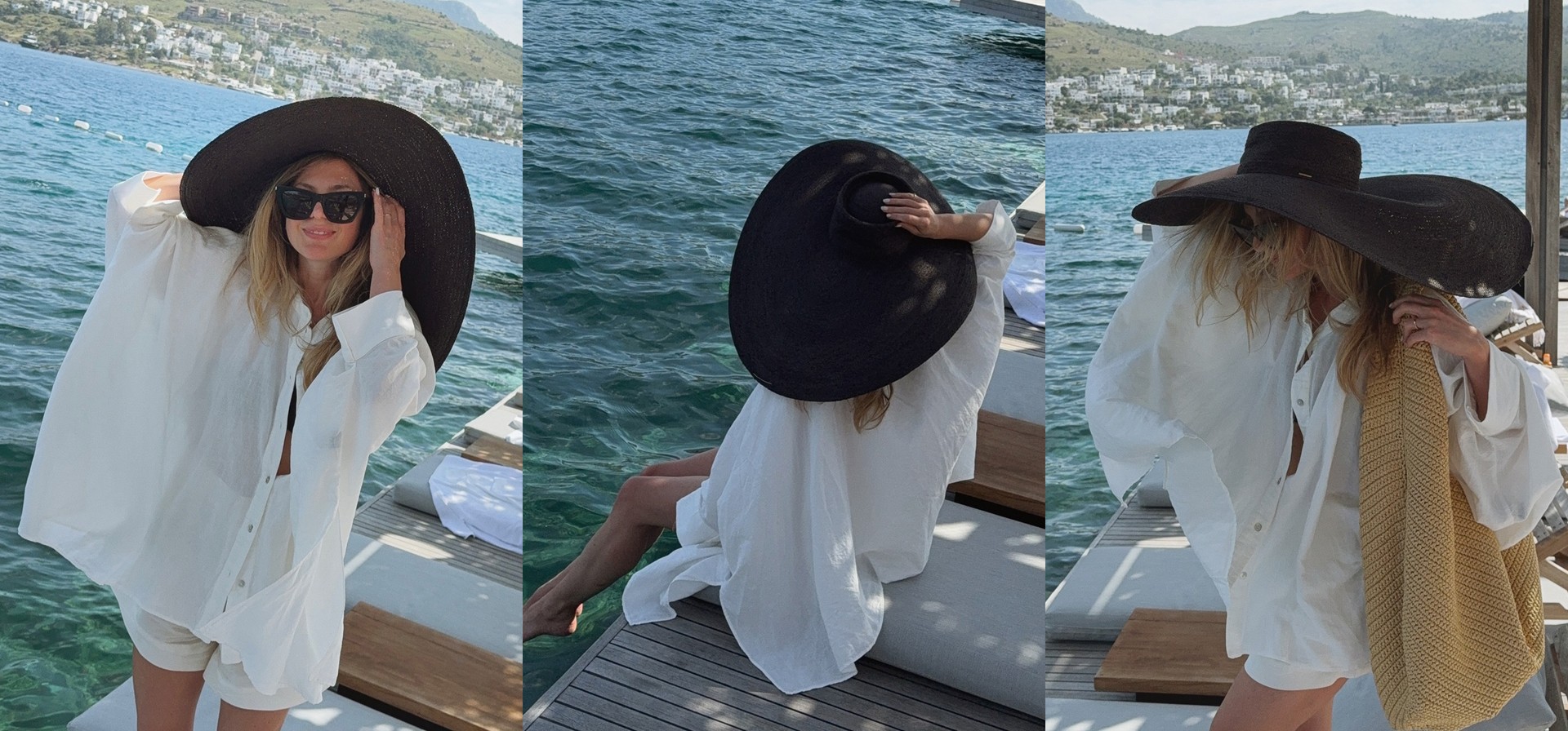 Sometimes the hat is the outfit. This Zimmermann one came with me to Bodrum and worked so well by the sea – both as a statement piece and as sun protection. I love pairing something easy like an oversized cotton shirt with one standout accessory.