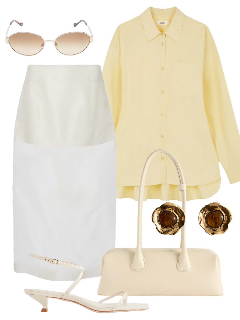 A pop of yellow puts a modern, fresh twist on this silk organza-style midi. Smart enough for the office, an oversized shirt feels relaxed and chic.
