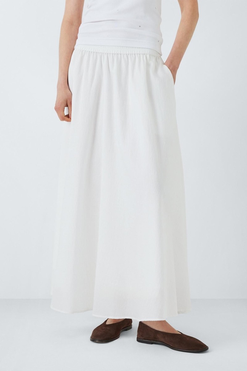 For effortless off-duty style, start with the white maxi from Dissh – its relaxed shape is ideal for easy summer days. Add a pretty crochet top from Massimo Dutti, classic leather flip flops, and a raffia clutch from COS for a laid-back yet elevated feel.