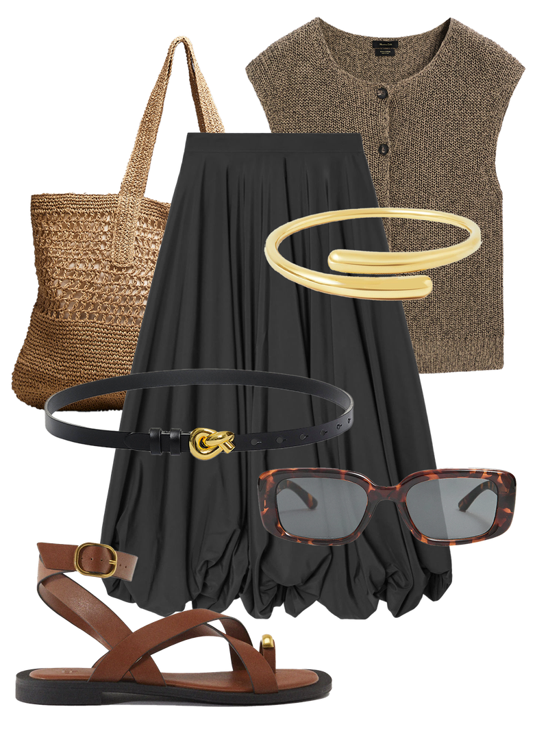 Waistcoats are everywhere this summer and this chunky, knitted Massimo Dutti one will transition well from summer to autumn . A straw bag and metallic-detailed sandals keep the look up to date.