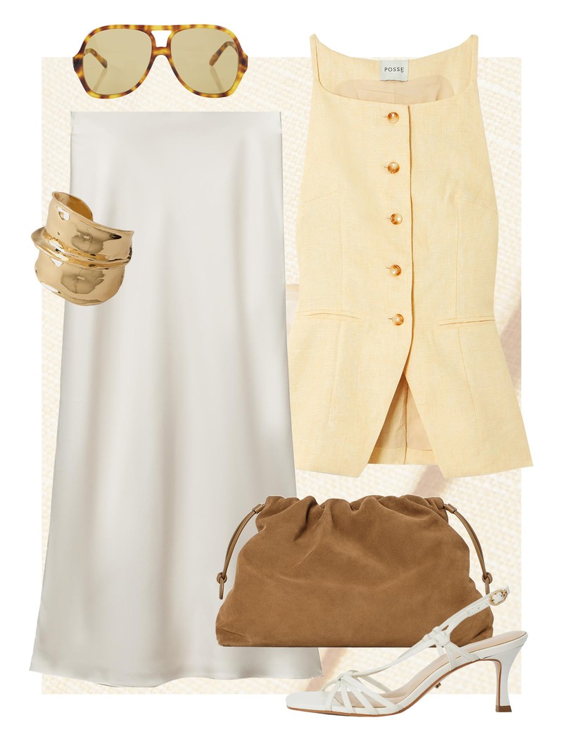 For a refined take on event dressing, team the waistcoat with a cream satin skirt. Sleek, tonal and elegant, this pairing is ideal for everything from garden parties to rooftop drinks. Complete the look with strappy heels and a sculptural cuff.
