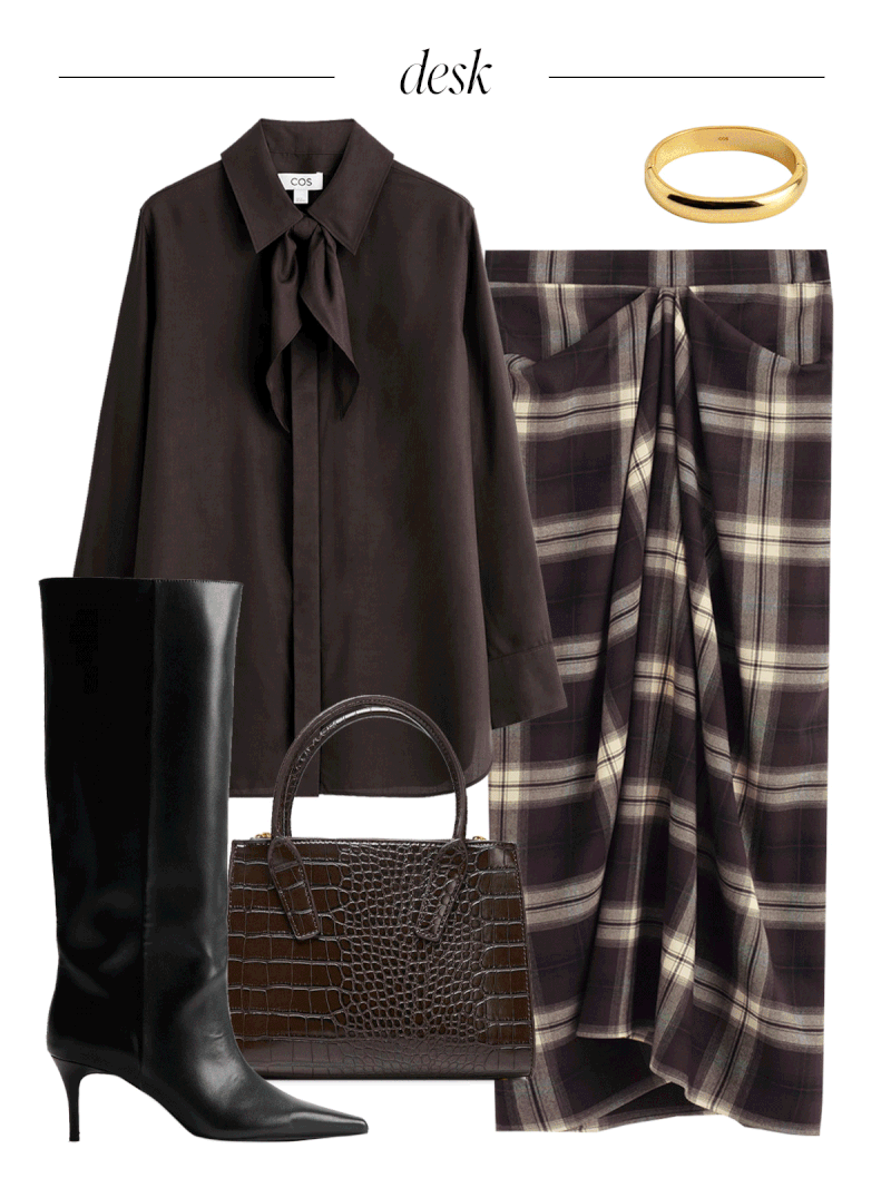 Chocolate brown is the shade of the season and a silky neck-tie blouse is the ideal day-to-night option. For work, style it with a check miniskirt and knee-high boots before switching to cream satin trousers later on. Gold jewellery and a faux-fur scarf are the perfect finishing touches.