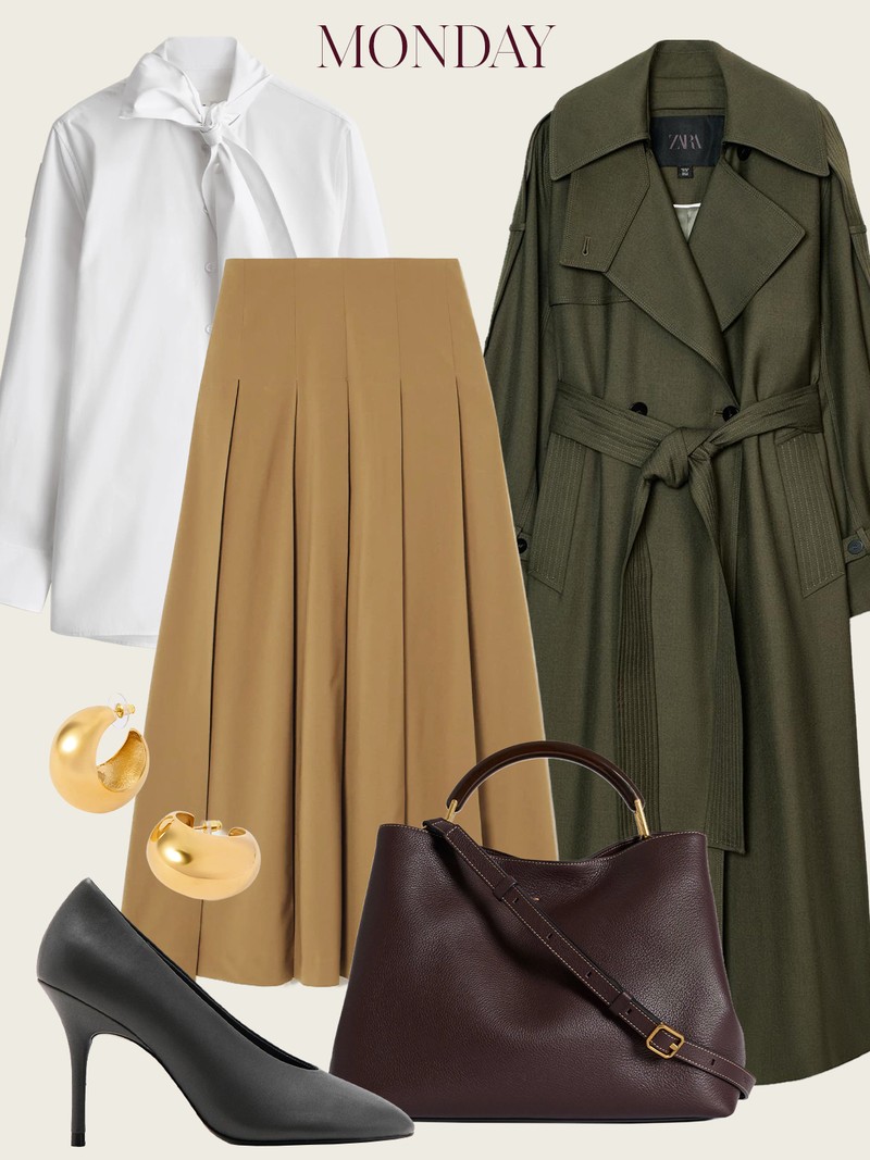 A beige pleated skirt paired with a tie-neck blouse strikes that perfect balance between softness and structure. Layer a long, belted mac over the top to sharpen the silhouette and finish with rich chocolate brown accessories.