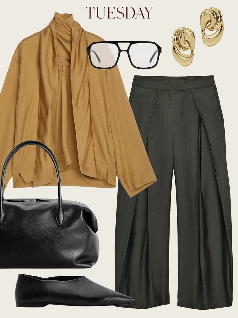 A draped blouse is a workwear hero – chic, effortless and instantly elevated. Pair it with pleat-front trousers and anchor the look with polished black accessories.